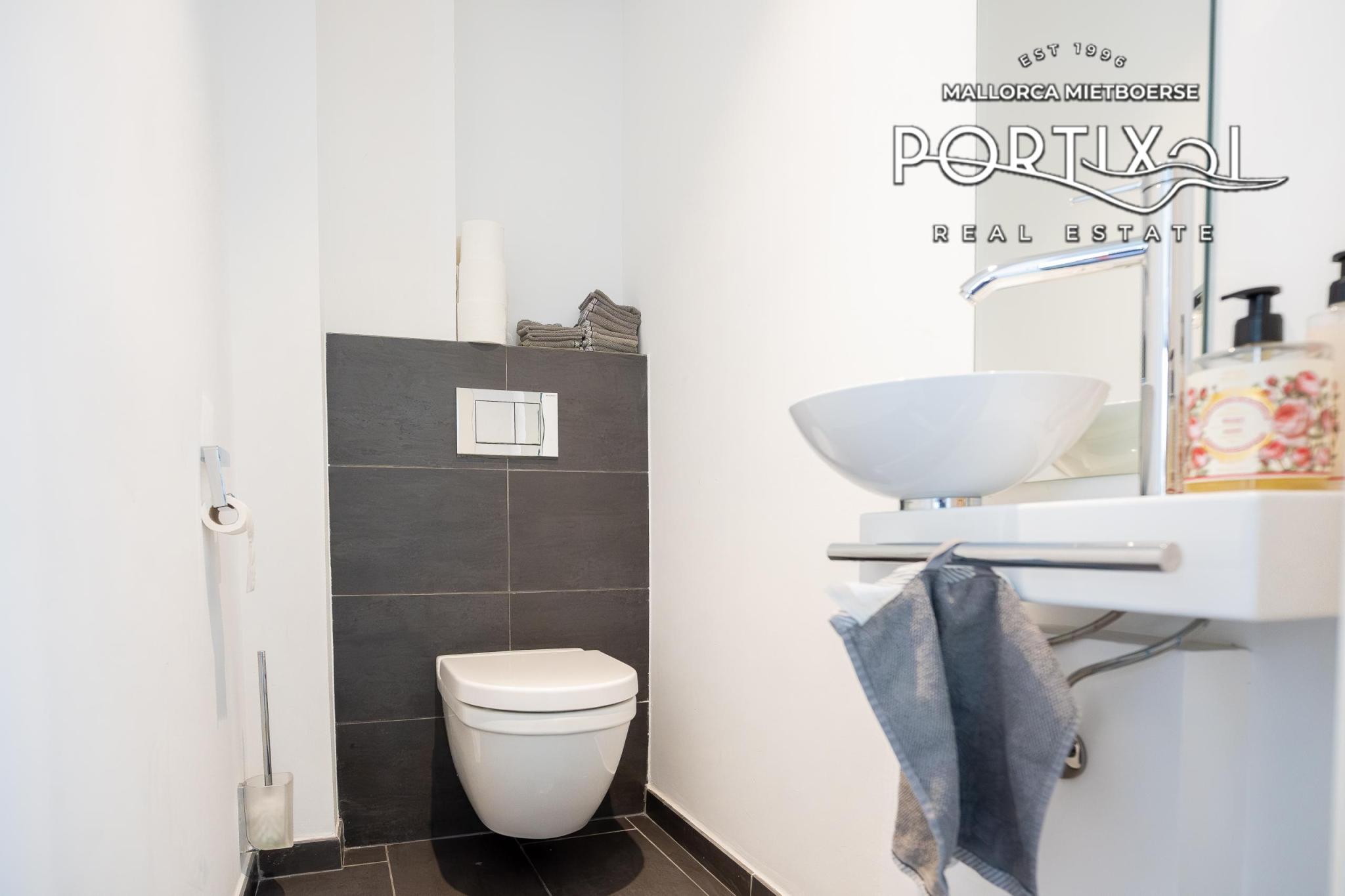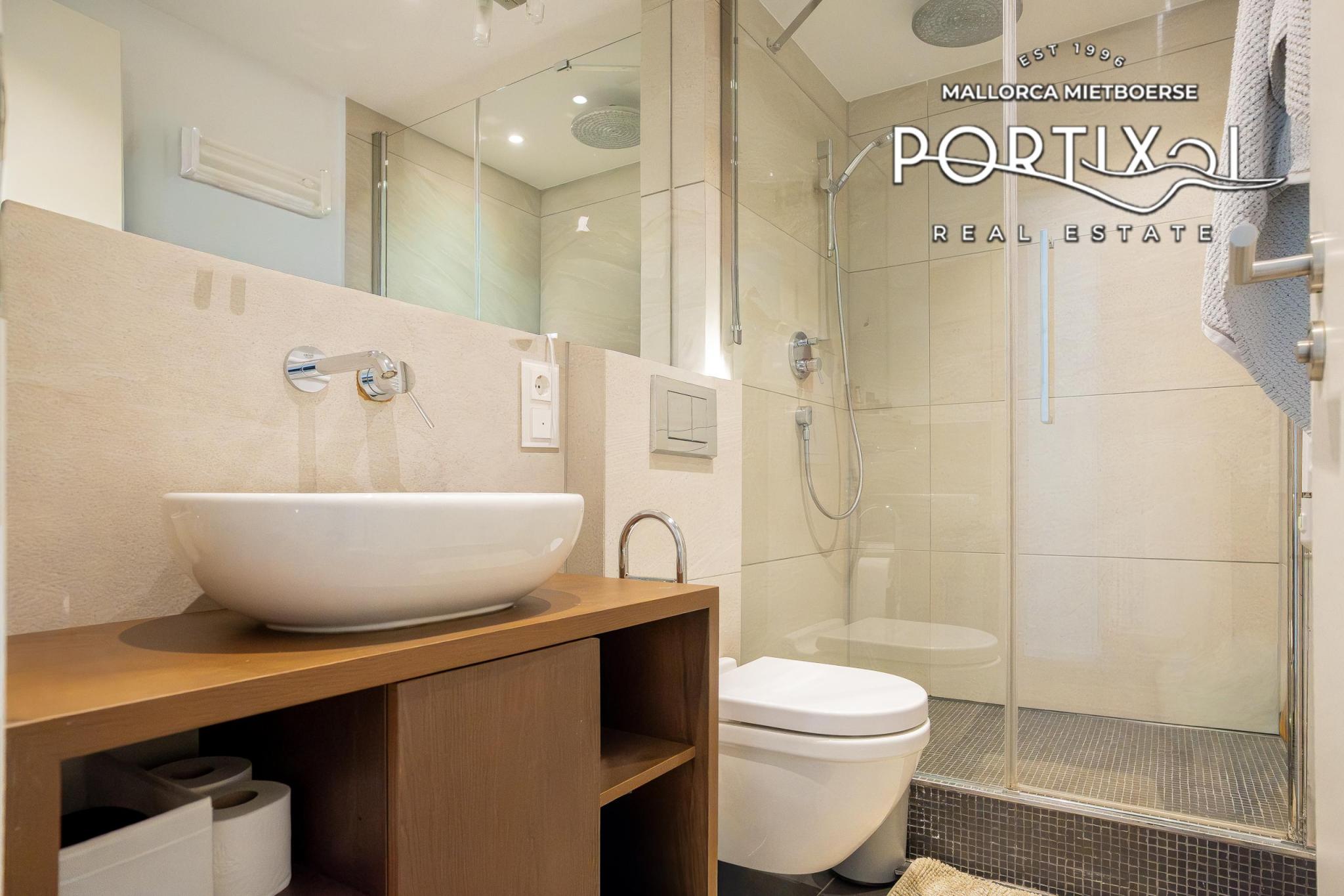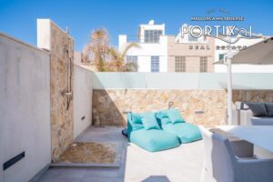 On the upper floor there are four bedrooms and two bathrooms. A staircase leads up to the spacious roof terrace, measuring approximately 30 m², which is equipped with a jacuzzi and offers a breathtaking 360° view of the Mediterranean Sea and the Tramontana mountains.