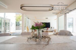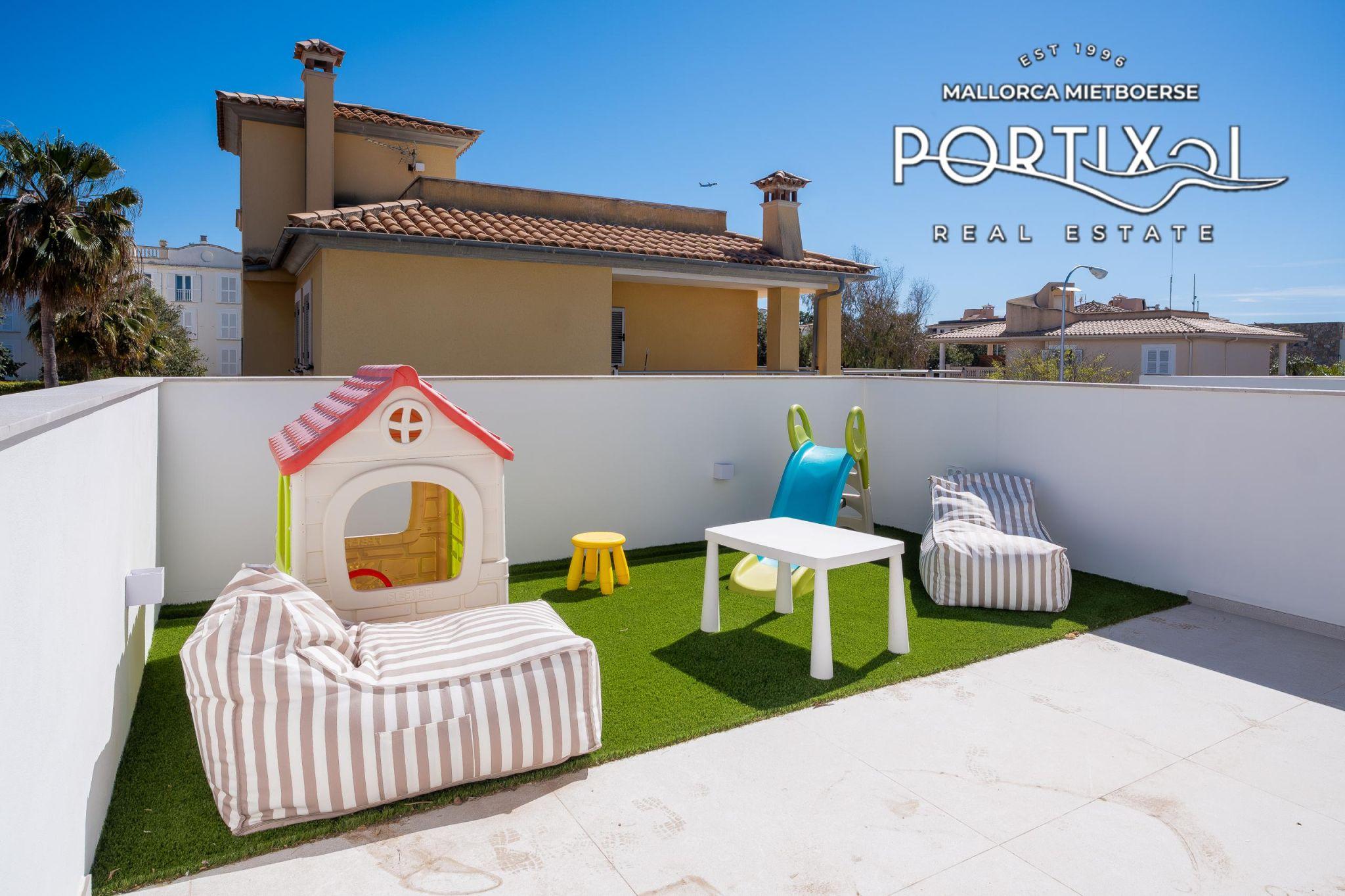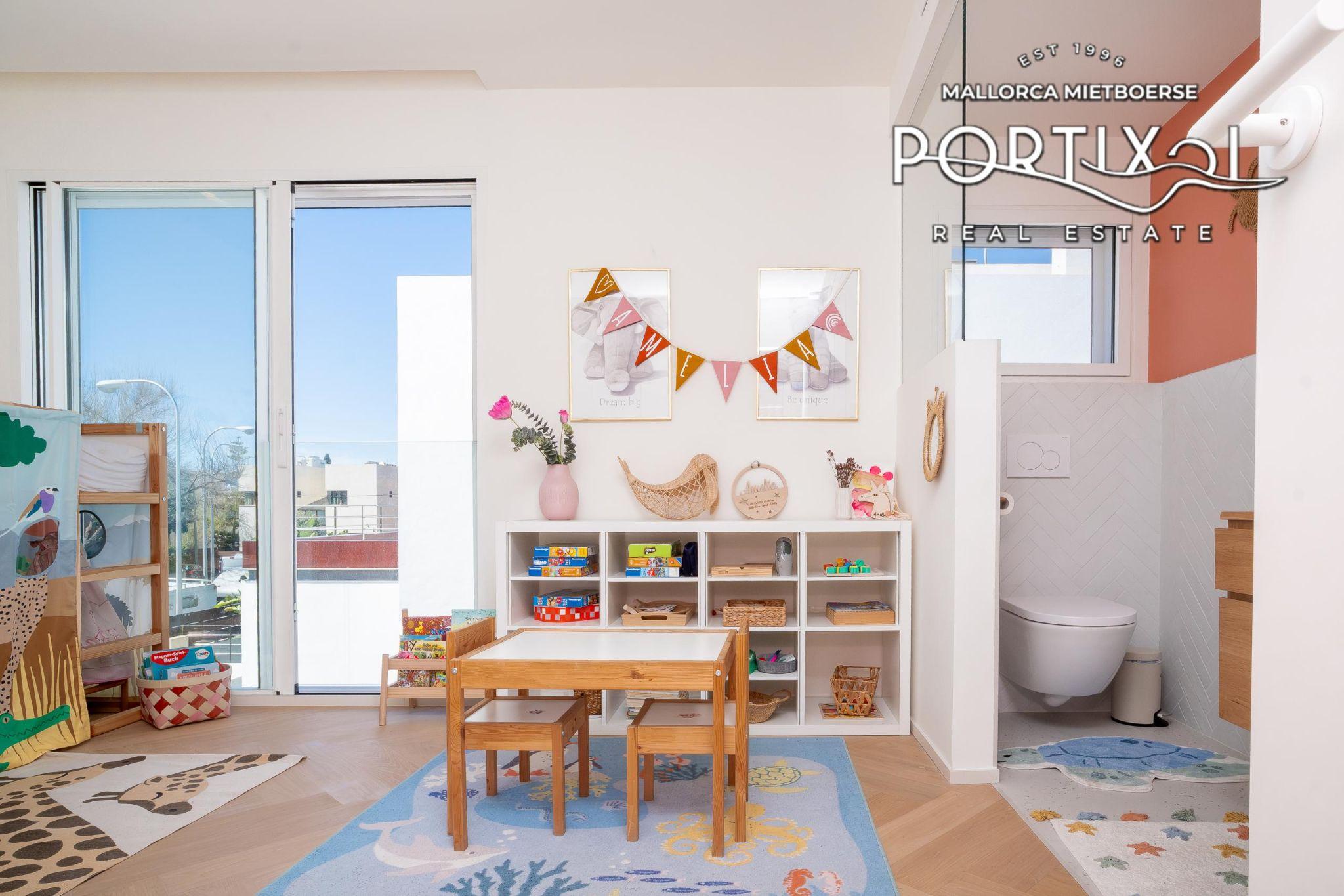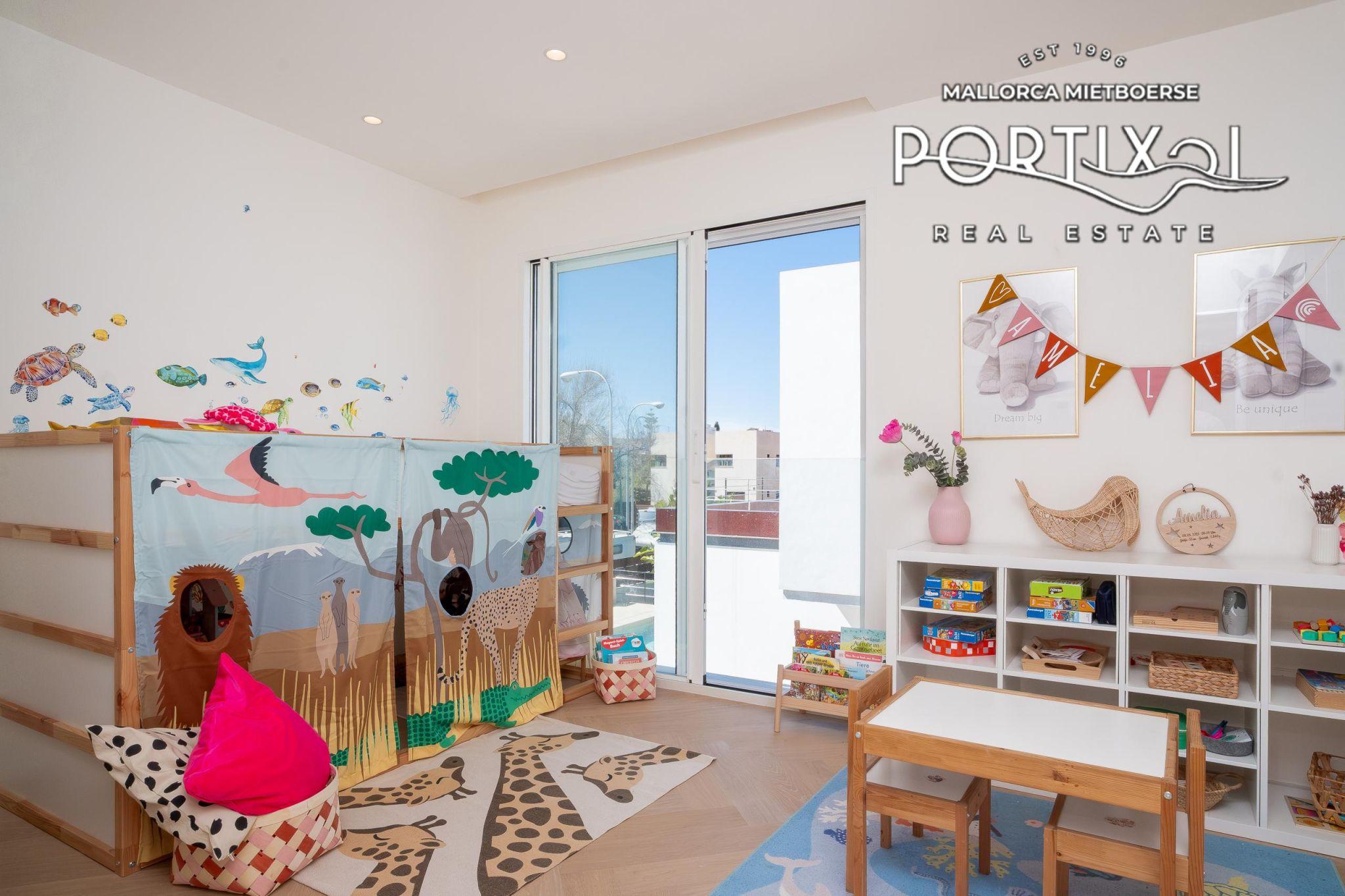 El corazón de la casa lo constituye el luminoso salón-comedor con chimenea, que invita a disfrutar de acogedoras veladas familiares. La cocina integrada totalmente equipada, una coladuría y un práctico trastero ofrecen una funcionalidad óptima. La casa cuenta con una sala de juegos para los niños, un pequeño gimnasio con sauna y varias terrazas soleadas, ideales para el ocio o el ejercicio físico.