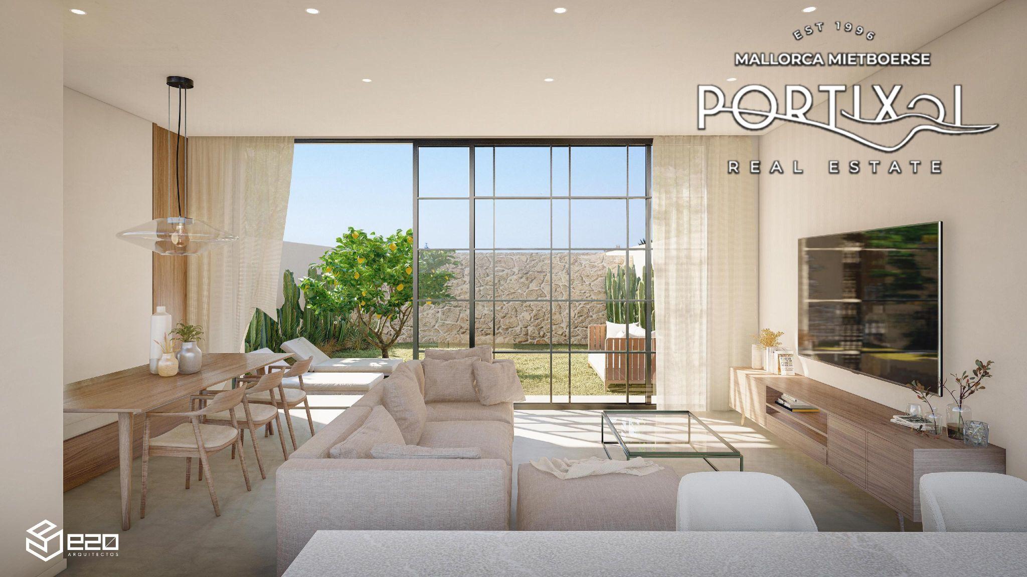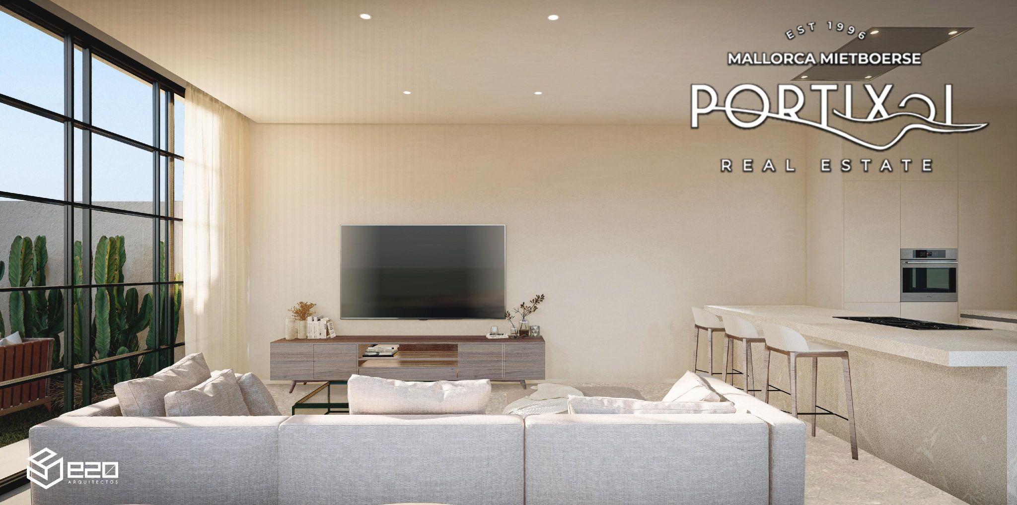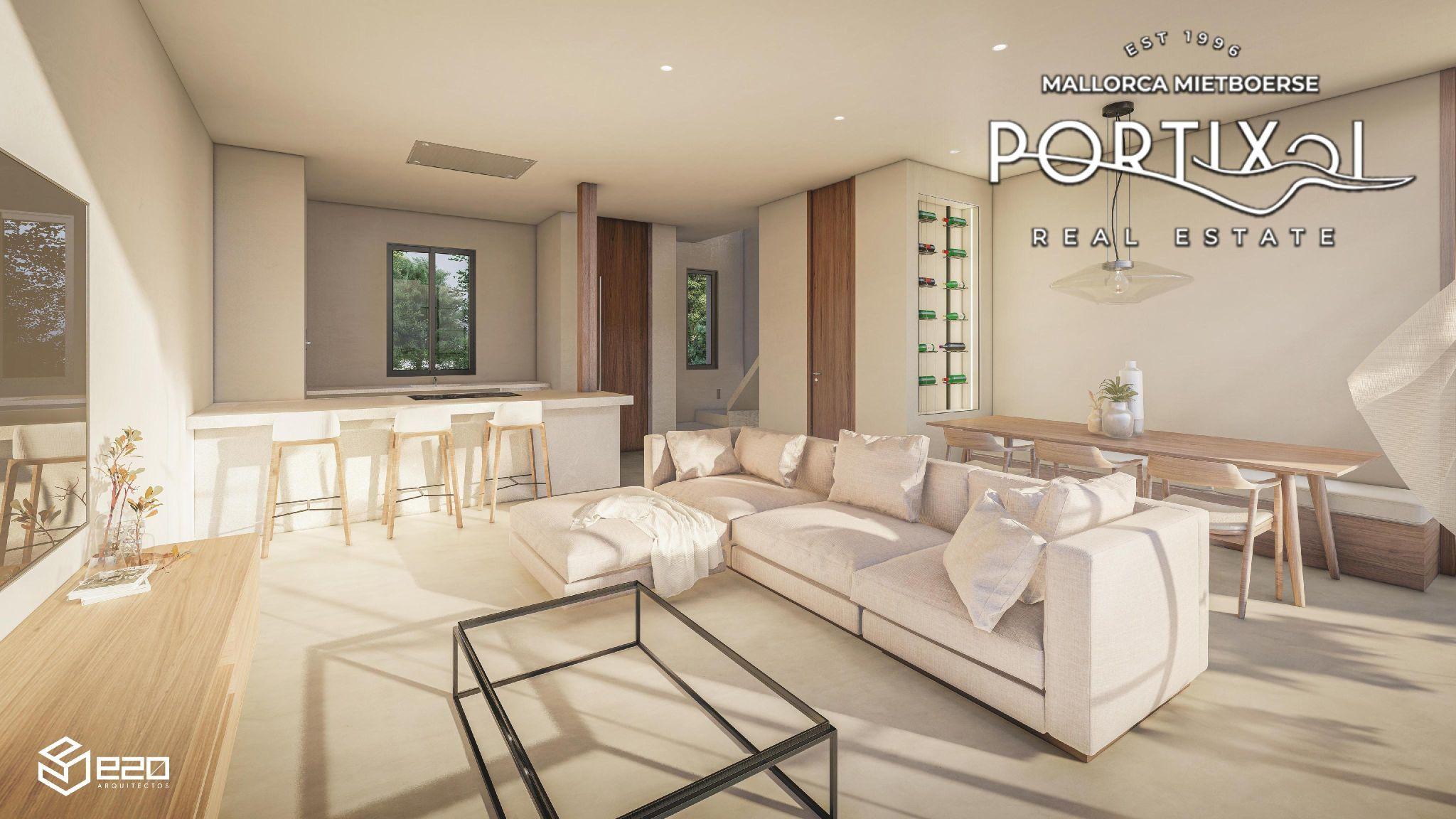En la planta baja le espera un salón-comedor diáfano y de diseño abierto que crea un ambiente acogedor. Los amplios ventanales dejan entrar mucha luz natural y permiten una transición fluida hacia el exterior. La elegante cocina con isla encaja armoniosamente en el conjunto y ofrece ventajas tanto funcionales como estéticas, lo que la hace perfecta para el día a día y para reuniones con amigos. Desde aquí se accede directamente al patio ajardinado de unos 36 m², que refleja a la perfección el estilo de vida mediterráneo.